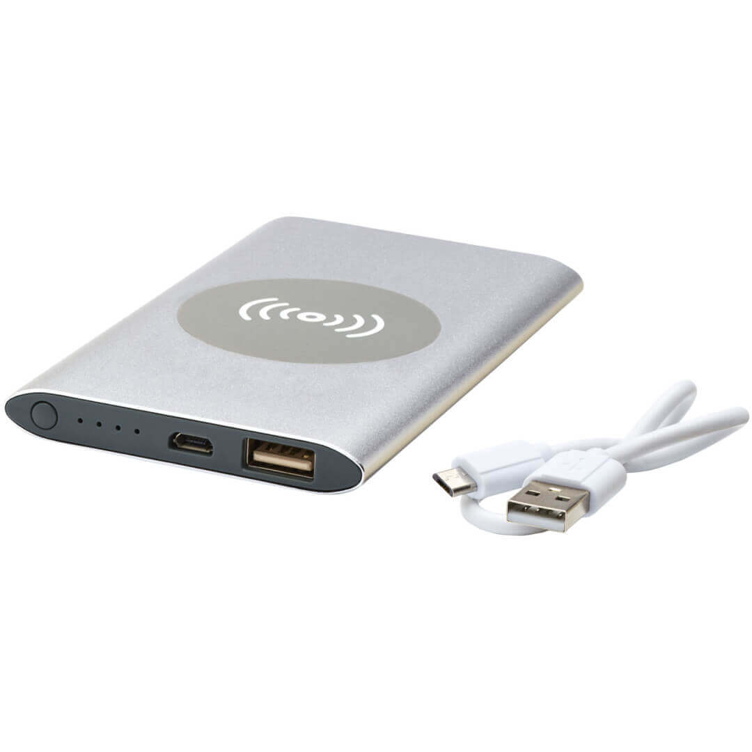 4000mAh Powerbank mit Aluminiumgehäuse. Unterstützt sowohl das kabellose 5W-Laden als auch das Laden über Micro-USB-Kabel. Mit einem 4000mAh Lithium-Polymer-Akku kann es Ihr Smartphone vollständig aufladen. Ladeanzeige, die kontinuierlich den Ladestatus anzeigt. Micro-USB-Eingang: 5V/2A; Ausgang: 5V/2A. Kabellose Leistung 5 W. Inklusive PVC-freiem TPE-Kunststoff-Ladekabel. Verpackt in einem Standard-Geschenkkarton.