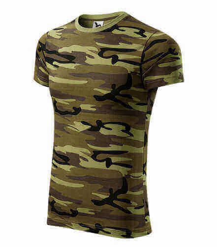 Triko střední gramáže v barvách camouflage. Střih s bočními švy. Lem průkrčníku z žebrového úpletu s přídavkem 5% elastanu. Vnitřní část zadního průkrčníku začištěna páskou v barvě camouflage. Zpevňující ramenní páska. Vhodné pro potisk a výšivku.