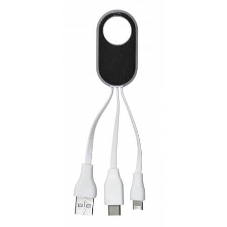 ABS 3-in-1 charging cable set with USB-C, Lightning, and standard USB. Each cable is approx. 5,5 cm long and attaches to a holder with opening (O 1,8 cm).