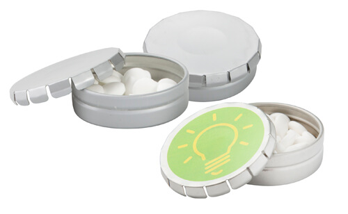 Menthol-Bonbons (12g) in einer runden Dose aus Metall, Deckel mit Klick-Verschluss.