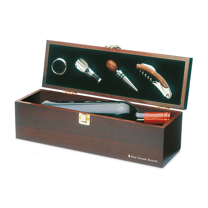Geschenkset mit Holzbox und 4 Weinaccessoires: Kellnermesser, Flaschenverschluss, Weinkragen und Ausgießer. Exklusive Wein.Produktnavigation