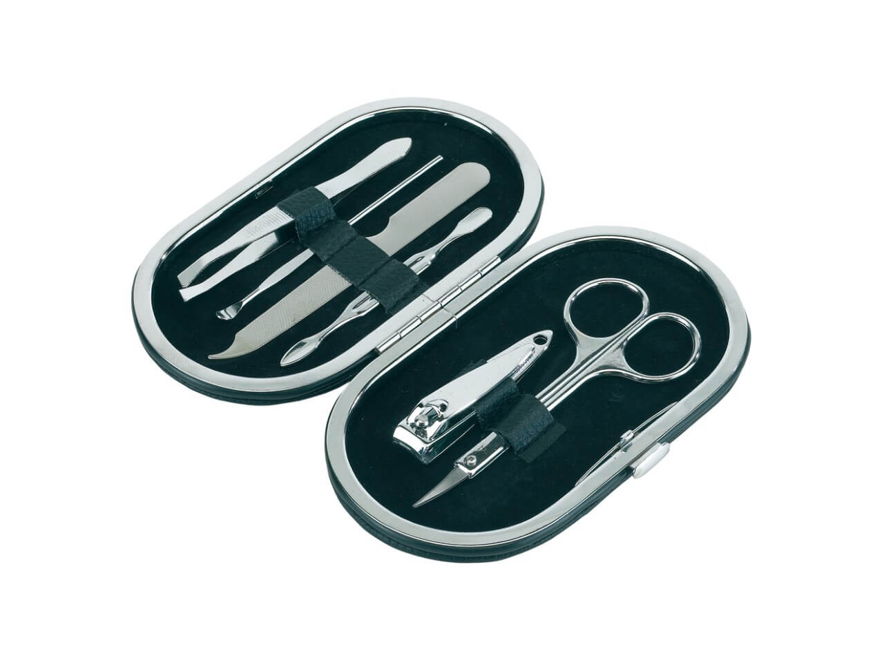 Elegantes Maniküreset "Denise" : bestehend aus Nagelschere, Nagelfeile, Pinzette, Nagelknipser, Nagelstab und Nagelschaber, im ovalen Etui mit Seitknopfverschluss