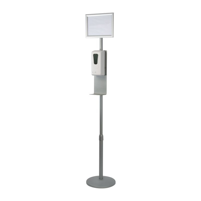 Stabiler Desinfektionsständer mit Dosiersensor, höhenverstellbar (125–165 cm), A4-Werbefläche, Tankvolumen für Desinfektionsgel oder -flüssigkeit: 1 l. Funktioniert mit DC-Adapter (6 V/1 A) oder 4 x 1,5 V Typ-C-Batterien, nicht im Lieferumfang enthalten im Paket.