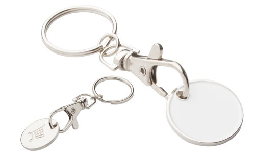 Schlüsselanhänger aus Metall mit Einkaufswagenchip. Farbig auf einer und mit graviertem Einkaufswagen auf der anderen Seite. Münzengröße: ø23 × 1,7 mm.Produktnavigation
