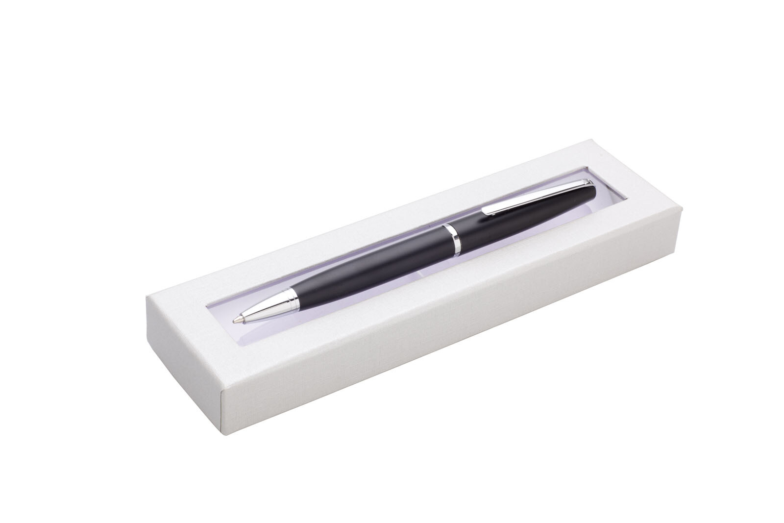 Kugelschreiber aus Metall in einer Geschenkbox mit Sichtfenster.