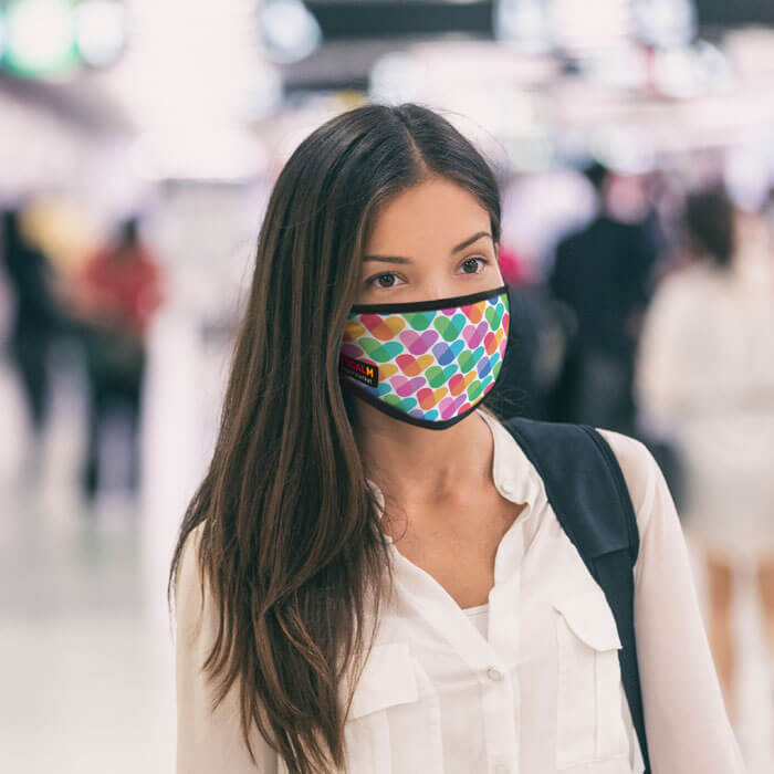 Polyester-Gesichtsmaske, 2 Schichten auf Bestellung. Das Tuch kann durch Vollfarbsublimation überall unterdrückt werden.