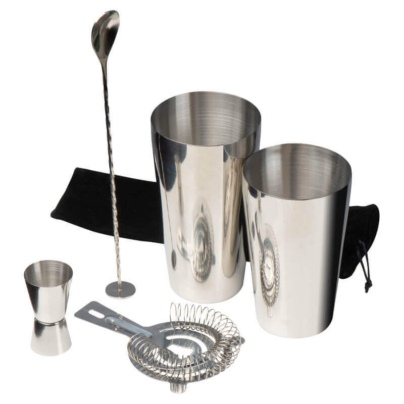 5-dielna kokteilová sada pozostávajúca zo šejkra, odmerky, sitka a tyčinky na miešanie vo velúrovom vrecku.
