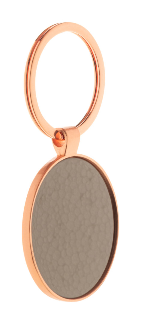 Runder Schlüsselanhänger aus Metall mit Goldfinish und Bronzebeschichtung. In einer Kraftpapierschachtel.