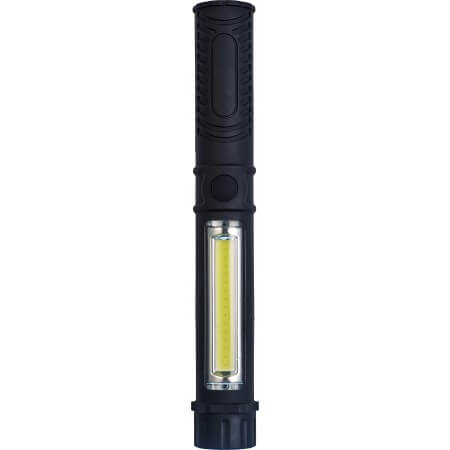 Plastic, magnetic work light/torch with COB lights on top and in the holder. Batteries included.