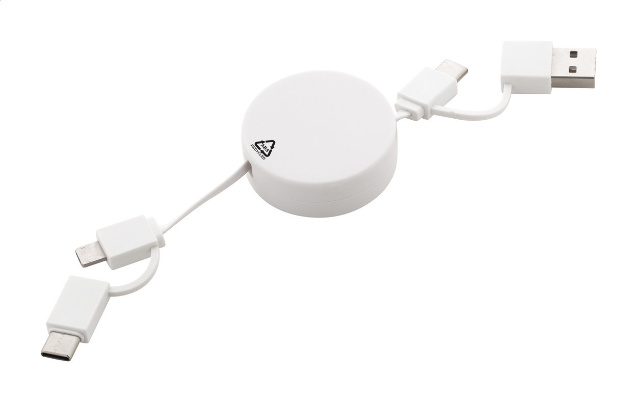 Teleskop-USB-Ladekabel aus recyceltem ABS mit Micro-USB-, USB-C- und Lightning-Anschlüssen.
