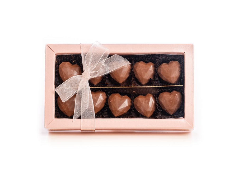 Produktbeschreibung Rosa Schachtel mit 10 Stück Bean-to-Bar-Pralinen von Herzen