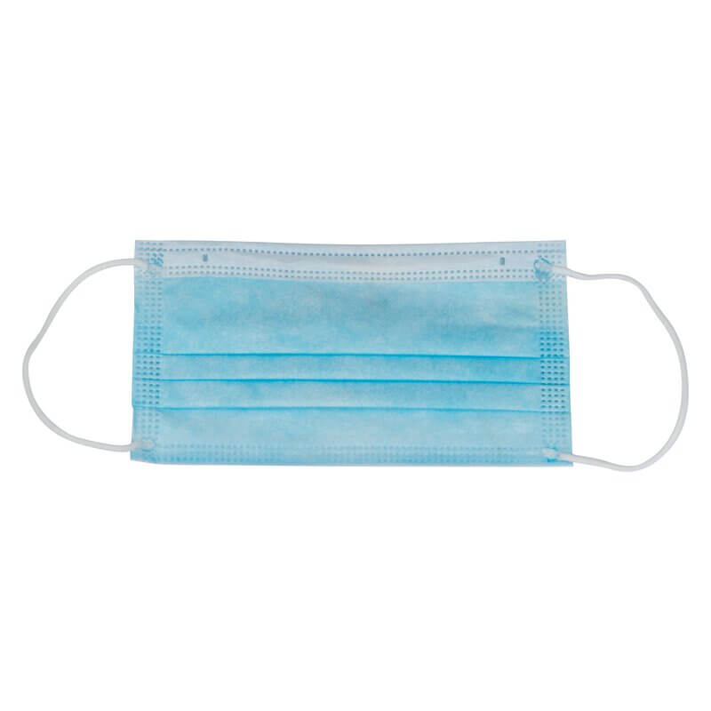 3-lagige Einwegabdeckung (Mund- und Nasenschutz) mit Gummibändern und Drahtverstärkung zur Fixierung.