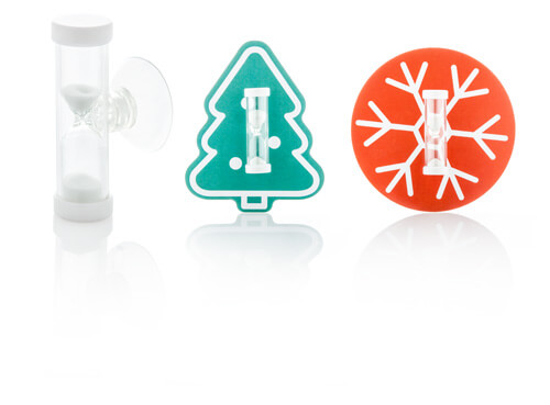 Sanduhr aus Kunststoff mit farbigem Sand und Saugnapf; 3 Min. Laufzeit. Mit personalisiertem Papiereinleger.