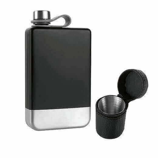 Schwarzwolf Set bestehend aus einer Likörflasche mit einem Fassungsvermögen von 266 ml, vier 30 ml Bechern in einem schwarzen Etui und einem Trichter. Die Likörflasche hat eine glatte schwarze Oberfläche und einen silbernen Boden aus Edelstahl. Das Schwarzwolf-Logo ist auf dem Boden des Likörs angebracht. Verpackt in einem Geschenkkarton. Material: Edelstahl Empfohlene Drucktechnik: Laser L1 Maximale Druckgröße: 50 × 15 mm Abmessungen: Likör 14,5 × 8 × 2,5 cm, Becher in Verpackung 6,5 × 4 cm Carbon Footprint: gCO2e 2760