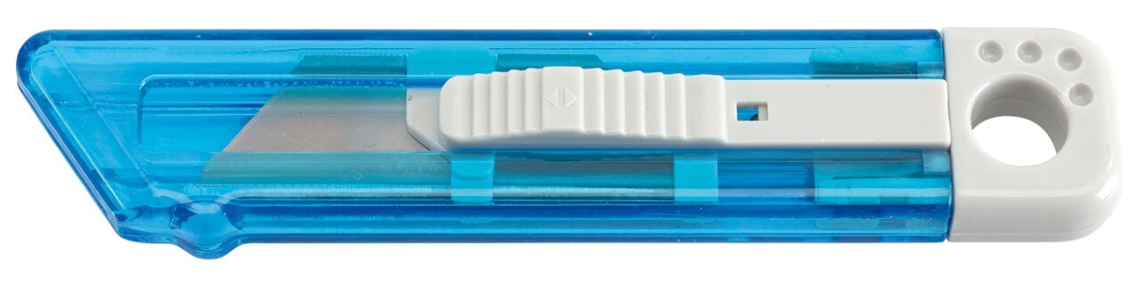 Cutter SLIDE IT : bouton poussoir avec ressort de rappel, lame interchangeable, coque plastique colorée avec oeillet pour accrocher. blue Plastic / Steel
