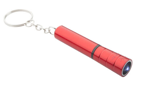 Mini Taschenlampe aus Kunststoff mit weißem LED Licht, Metalloptik und Metallring. Lieferung mit Knopfzellenbatterie.