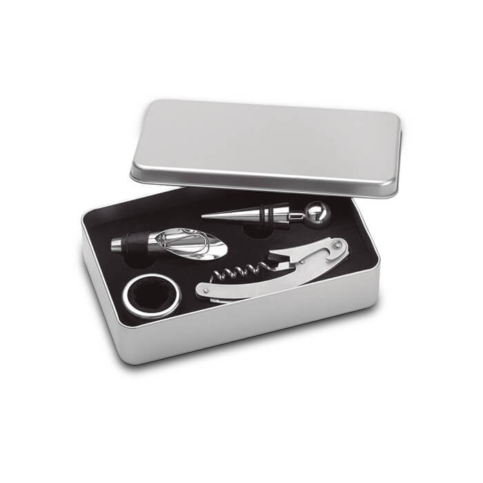 4-teiliges Weinset, bestehend aus Kellnermesser, Verschluss, Ausgießer und Weinkragen in einer Metalldose.Produktnavigation