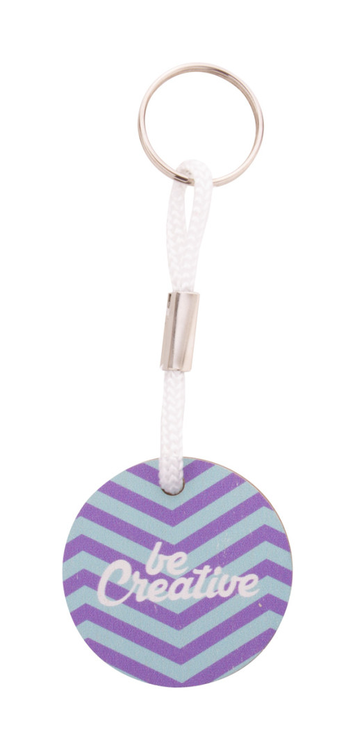 Schlüsselanhänger aus rundem Birkensperrholz mit farbigem Polyesterstreifen und Vollfarbdruck. Preis inkl. UV-LED-Druck auf einer Seite, ohne Druckvorbereitung. Mindestmenge: 200 Stück.