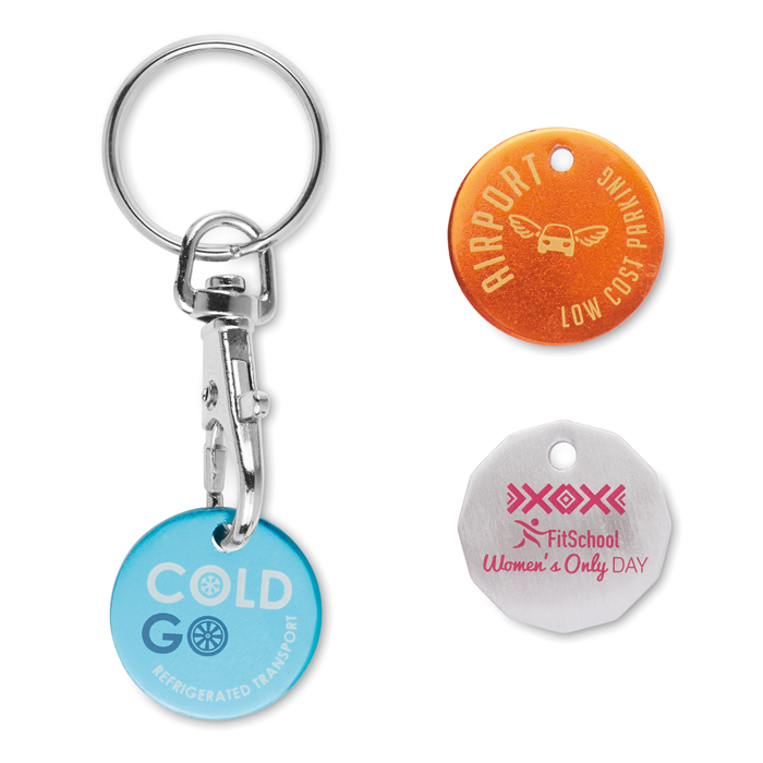 Hliníkový žetón (0,50 €, 1 € alebo nový 1 €). Vyberte si štandardnú farbu alebo si nechajte zladiť farbu PMS (nad 5.000 kusov). Dodáva sa s kovovou kľúčenkou zabalenou v sáčku a voliteľne s plnofarebnou obojstrannou papierovou kartou (do 12x6cm/300gr).