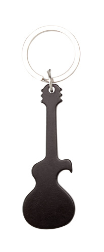 Aluminium Schlüsselanhänger in Form einer Gitarre. Mit Flaschenöffner-Funktion.