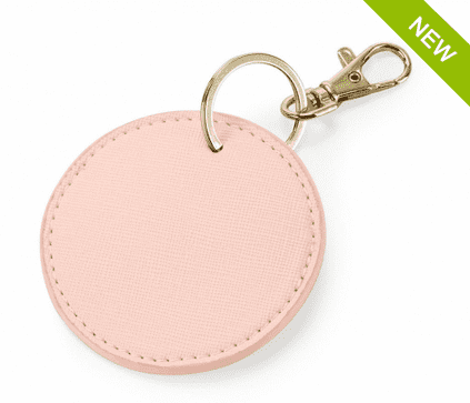 100% Polyurethan (Lederoptik), feines Saffiano, glänzender Metall-Schlüsselclip, Maße: 7x6 cm, max. Druckfläche: 4x3 cm