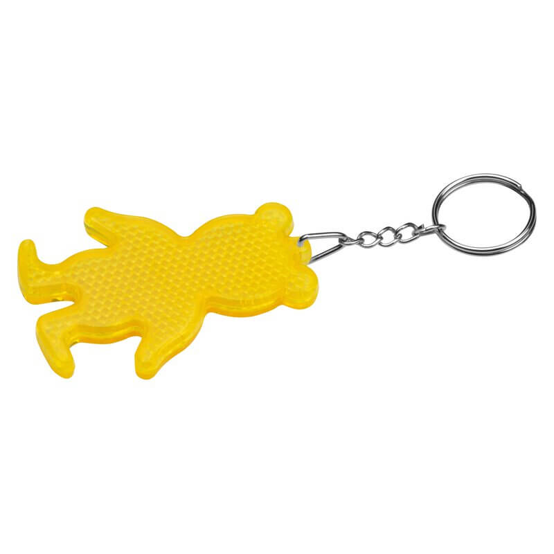 Schlüsselanhänger aus Kunststoff in Form eines Bären mit reflektierender Oberfläche. Druckverfahren Tampondruck.