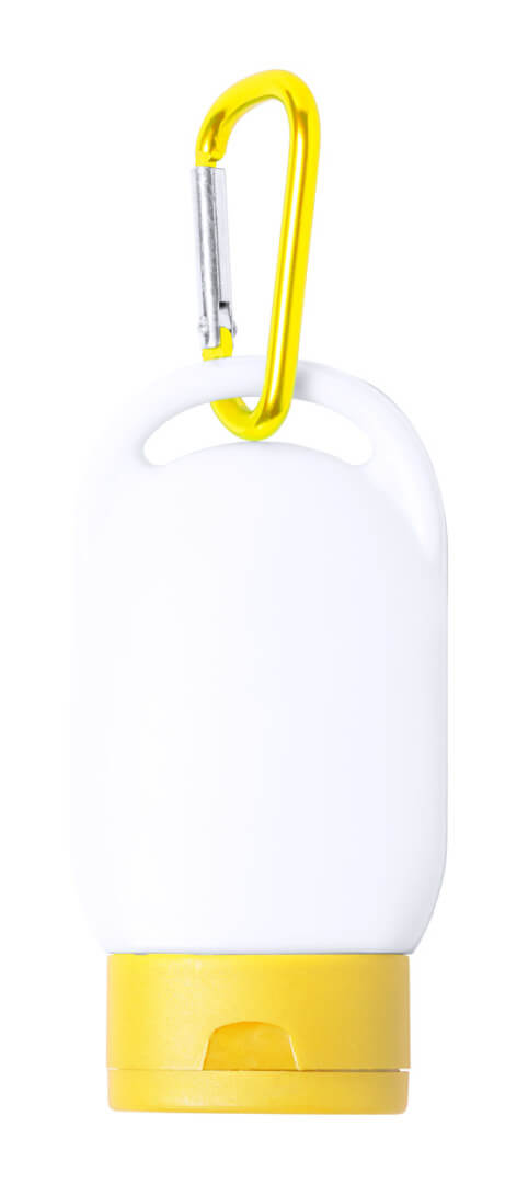 Sonnenschutzlotion in einer Kunststoffflasche mit farblich passender Kappe und Karabiner. LSF30-Schutz, 30 ml.