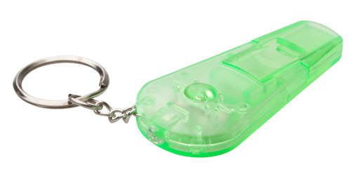 Transparenter Schlüsselanhänger aus Kunststoff, mit weißem Licht und in Form einer Pfeife; Lieferung mit Batterie.
