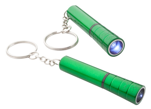 Mini-Taschenlampe mit 1 LED, Kunststoff-Gehäuse mit Metall-Schlüsselring. Das gravierte Logo aur dem Korpus wird beleuchtet. Inkl. Batterien (Knopfzellen).