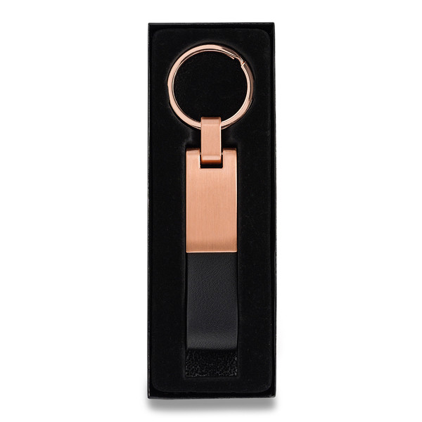 Schlüsselanhänger aus roségoldenem Metall in Kombination mit schwarzem Kunstleder. Verpackt in einer schwarzen Geschenkbox aus Karton.