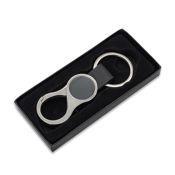 Silver plated steel key chain with PU loop. Presented in a black gift box.