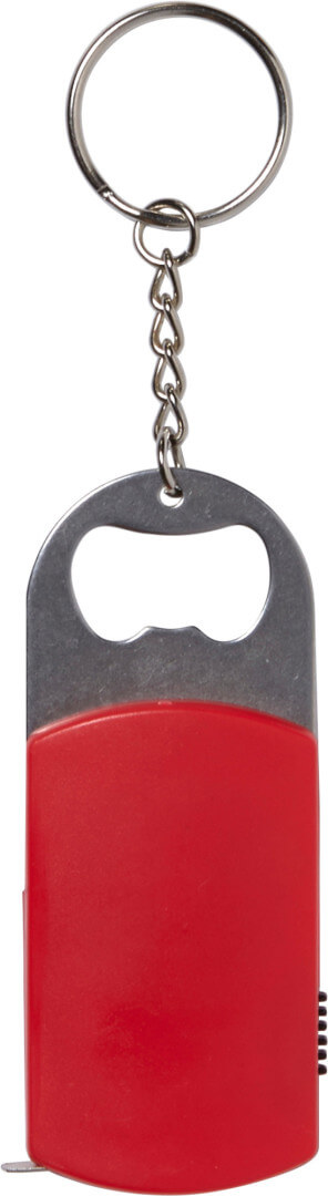 Metal bottle opener with steel key ring, one white LED and a one meter tape measure. Batteries included.