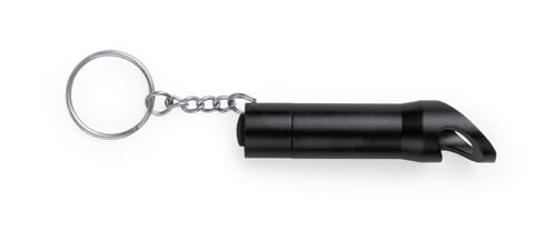 Pocket-sized LED flashlight with key ring. The glossy casing is especially designed for laser engraving; the imprint will be illuminated when the flashlight is switched on. Batteries included.
