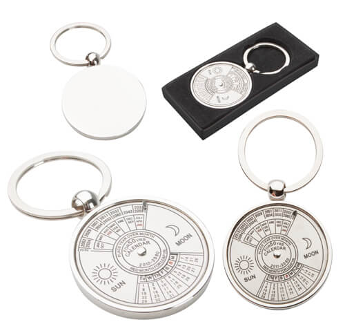 Schlüsselanhänger aus Metall mit drehbarem Kalender bis zum Jahr 2060. Lieferung in schwarzer Kartonbox.