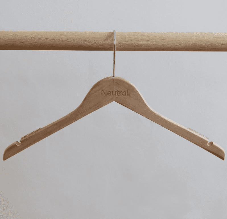 Kleiderband aus Eichenholz, bedruckt mit dem Markenlogo.