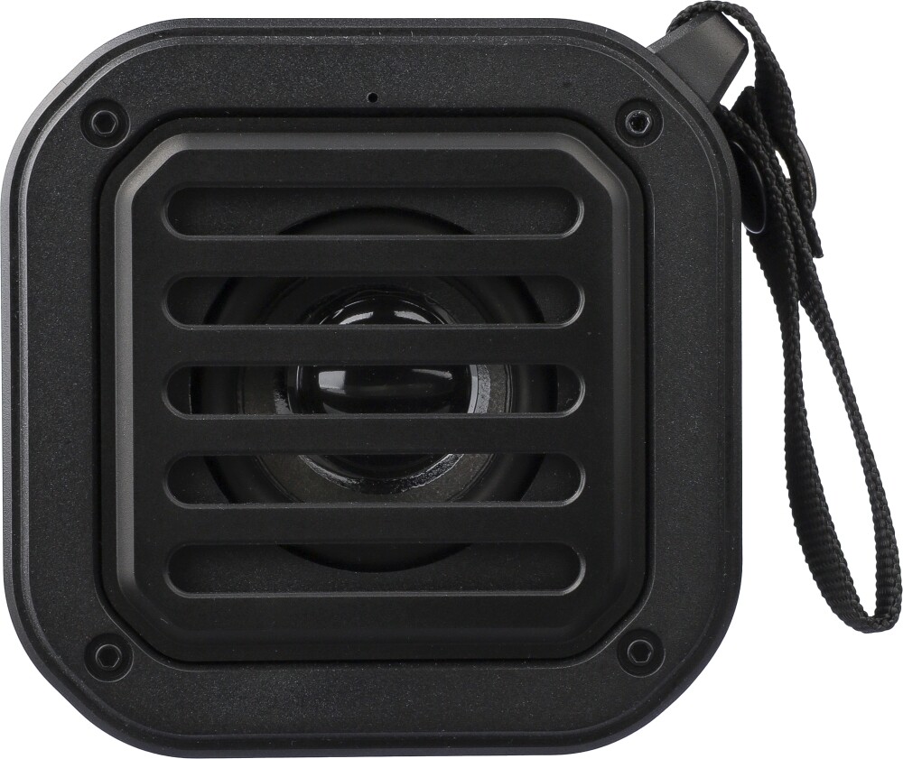 Recycled ABS outdoor speaker with wristband and carabiner. IPX6 rated. 3W output, DC 5V input, 400mAh built-in rechargeable battery, with 4 hours of playing time. Working distance of 15-20 meters, signal-to-noise ratio of 75 dB. Frequency range: 100 Hz to 20 kHz. Includes 30 cm Type-C charging cable, built-in LED flashlight (30 lumens), and solar panel to extend usage. Wireless connection technology: 5.3. Individually packaged in a brown cardboard box. Dimensions: 4,2 x 9,1 x 9,1 cm