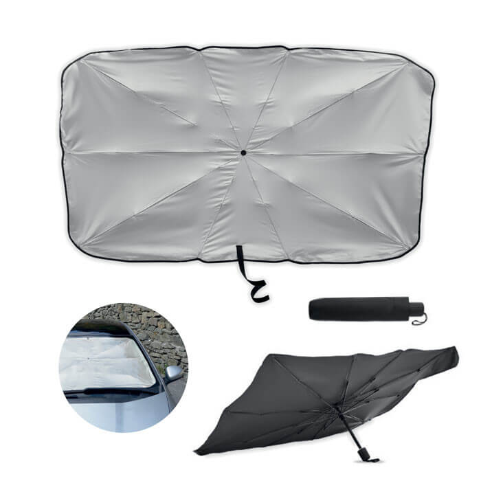Aluminium-Autosonnenblende für Windschutzscheiben, mit Gummibändern zum Zusammenklappen. Min. Menge: Vielfache von 100 Stück.