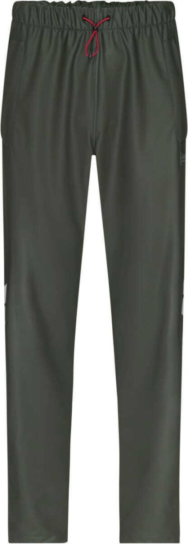 60% Polyester, 40% Polyurethan. Wind- und wasserabweisend (Wassersäule 10 000 mm), elastischer Saum mit Kordelzug, Klettverschlüsse an den Knöcheln zur Weitenregulierung, lange verdeckte Reißverschlüsse mit Laschen zum einfachen Überziehen der Hose mit Stiefeln, verschweißte Nähte, reflektierende Elemente (ohne Schutzfunktion).