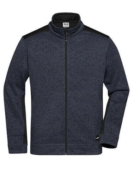 280g/m², 100% Polyester, Stehkragen mit unterlegtem Reißverschluss mit Kinnschutz, weiches wärmendes pflegeleichtes Material in Melange-Optik, Außenseite Strickoptik, Innenseite flauschig weich angeraut, elastische Softshelleinsätze an Seiten Schultern und Ärmel