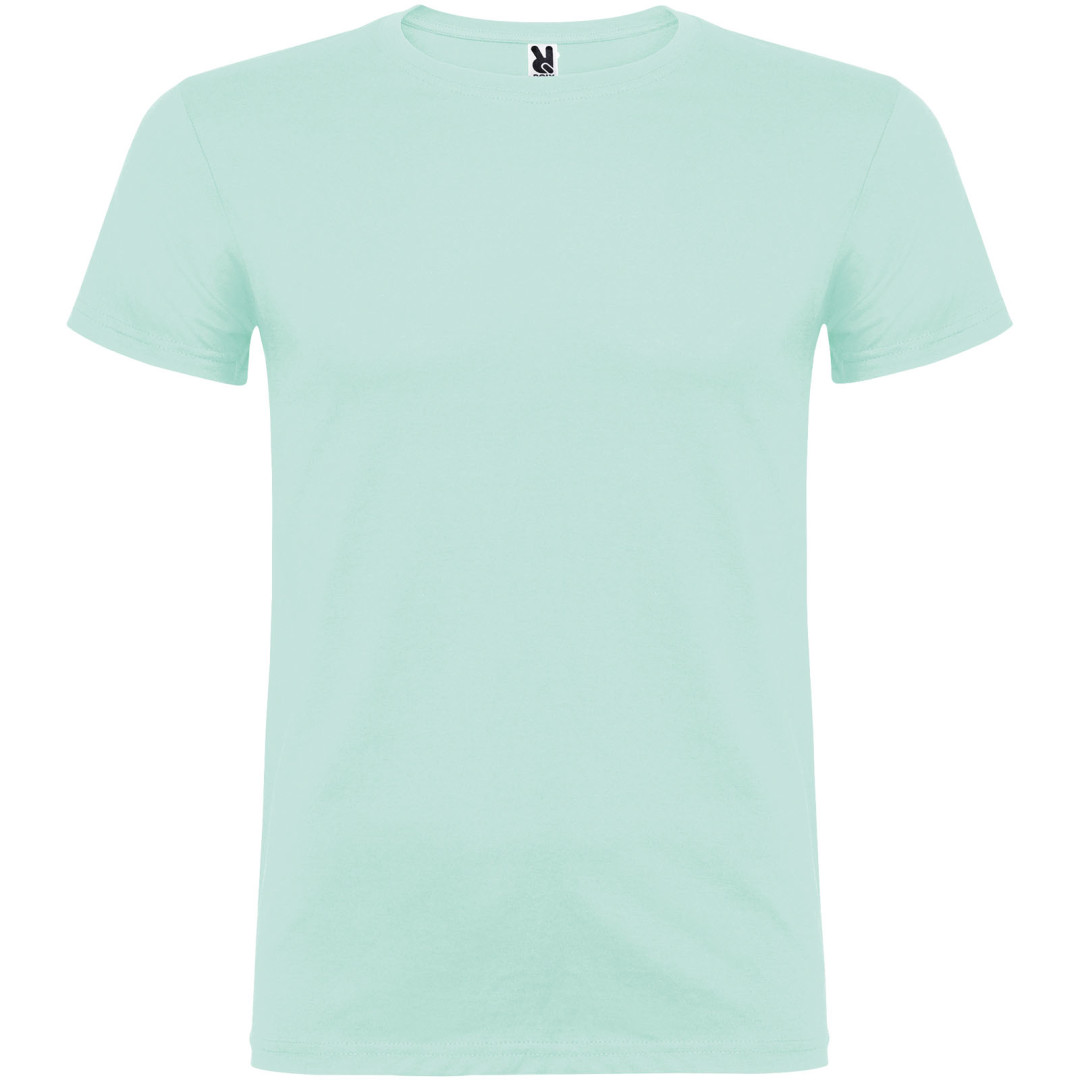 Kurzarm-T-Shirt mit doppellagigem Elasthan-Ausschnitt aus Schlauchware für Erwachsene. Verstärkte verdeckte Nähte im Kragen. Abnehmbares Etikett. Das Model ist 190 cm groß und trägt Größe L.