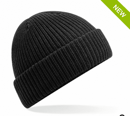 Recycelte Doppelstrickmütze für Drucker 340 g/qm, hergestellt aus 50% Polyacryl (recycelt), 50% Polyacryl (weich), Baumwollköperapplikation für Drucker, doppelte Dicke, volle Größe, tiefes Bündchen.