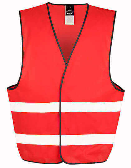 ·100% Polyester ·Sicherheitsweste mit Reflektorstreifen ·Großzügig geschnitten, kann über der Kleidung getragen werden ·Einfassungen in Black ·ISOEN20471:2013 Klasse 2.