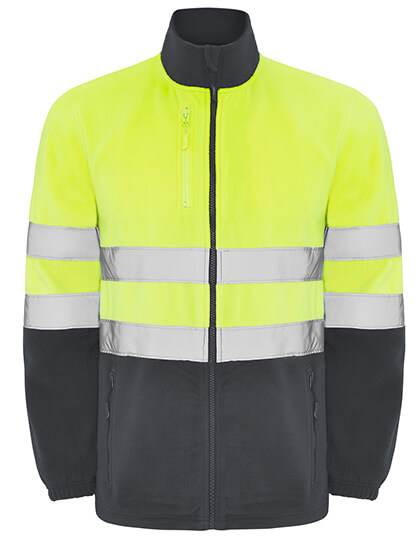 100% Polyester, Microfleece, 300g/m² | Durchgehender Reißverschluss mit Kinnschutz | Zwei reflektierende Streifen auf Brust und Ärmeln | Zwei Fronttaschen mit Reißverschluss im gleichen Stil und eine Brusttasche | Elastische Kordelzüge mit Stopp am Saum | Winddicht | Zertifiziert nach CE-Normen: EN ISO 13688:2013 und EN ISO 20471:2013/A1:2016, Klasse II | Hersteller garantiert reflektierende Eigenschaft nach EN für 25 Waschgänge bis 30°C
