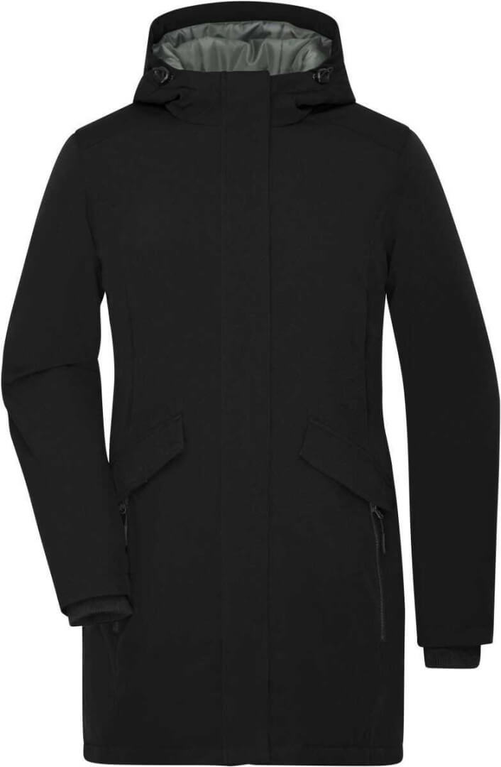 Wasserdichter, isolierter Parka für Damen. Schmale Passform. Hoher Kragen und Klettverschluss. Praktische faltbare Kapuze. Zentraler Reißverschluss passend zur Klappe. Seitentaschen mit Reißverschluss und fester Klappe. Innentasche mit Klettverschluss. Verstellbare Manschetten mit Gürtelschlaufe. Möglichkeit des Zugriffs auf die Verstärkungen am Rücken und der linken Brust.