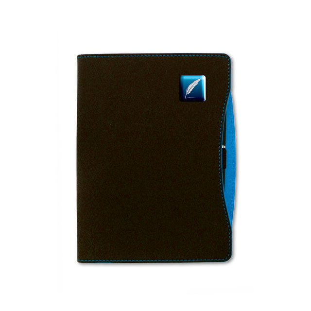 A5-Notizbuch mit weicher, gummierter Oberfläche und Harzaufkleber mit Federmotiv. Cremefarbenes liniertes Innenpapier.