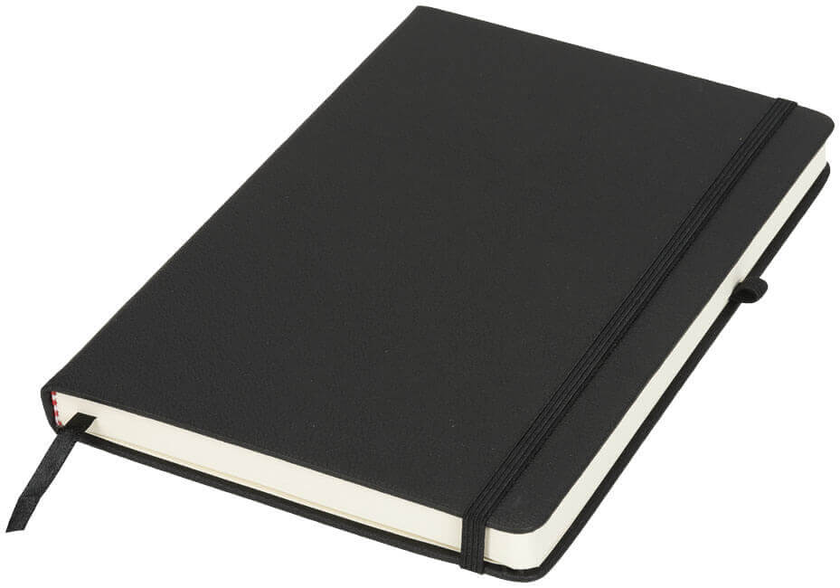 Noir A5 Notizbuch. Das schwarze Notizbuch hat einen weichen schwarzen PU-Einband für eine angenehme Haptik des Notizbuchs. Jedes Notizbuch hat einen farbigen Verschlussriemen, eine Stiftschlaufe und ein Bandlesezeichen. Das Notizbuch enthält 96 Blatt (70 g/m²) cremefarbiges liniertes Papier. Mindestabnahmemenge 50 Stück. PU Lederimitat.