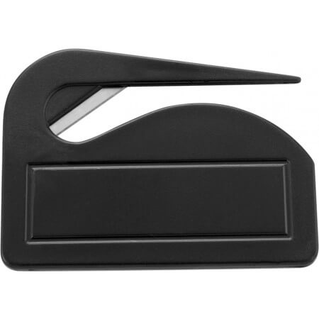 Plastic letter opener with metal cutting edge.