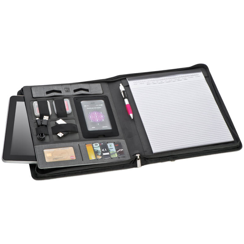 DIN A4 Konferenzfach mit Ringbindung aus hochwertigem geklebtem Leder mit Reißverschluss. Enthält einen Visitenkartenhalter, einen Stifthalter, einen Smartphone-Halter, einen Tablet- oder Notebookständer und ein 30-seitig gefüttertes Touchpad mit einem gedruckten Kalender.