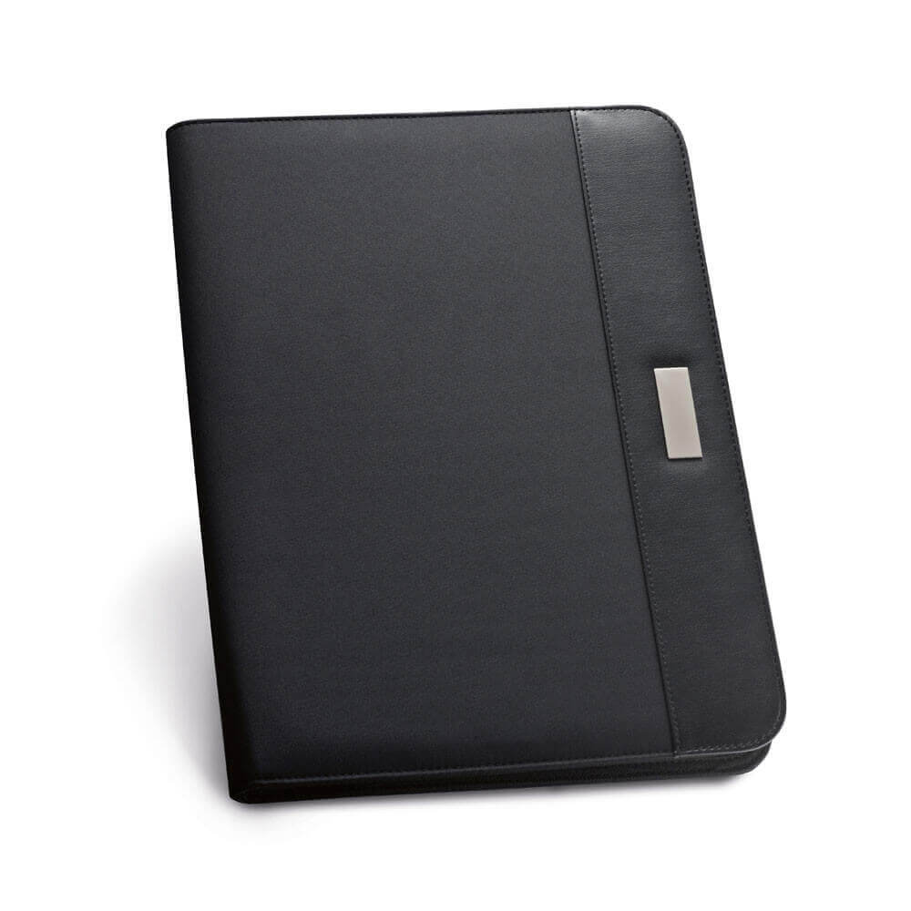A4 Tech Portfolio mit luxuriösem, magnetischem Metallverchluss. Im Inneren befindet sich ein Tablet-/Handyhalter mit transparentem Fenster, über dieses Sie Ihr mobiles Gerät im Auge behalten und bedienen können. Passend für alle herkömmlichen Handys, u.a. iPhone 6 & Samsung S6. Inkl. Dokumentenhülle, 2 Kartenhaltern, Stifteschlaufe und 1 A4 Notizblock mit 20 Blättern. PMS color 1: Black PMS color 1: Cool Grey 7 PMS color 1: 534, PMS color 2: Black