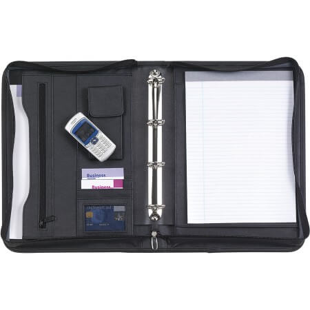 A4 Bonded leather zipped conference folder, includes different pockets, a note pad, a four ring mechanism, carry handle and metal engraving plate.